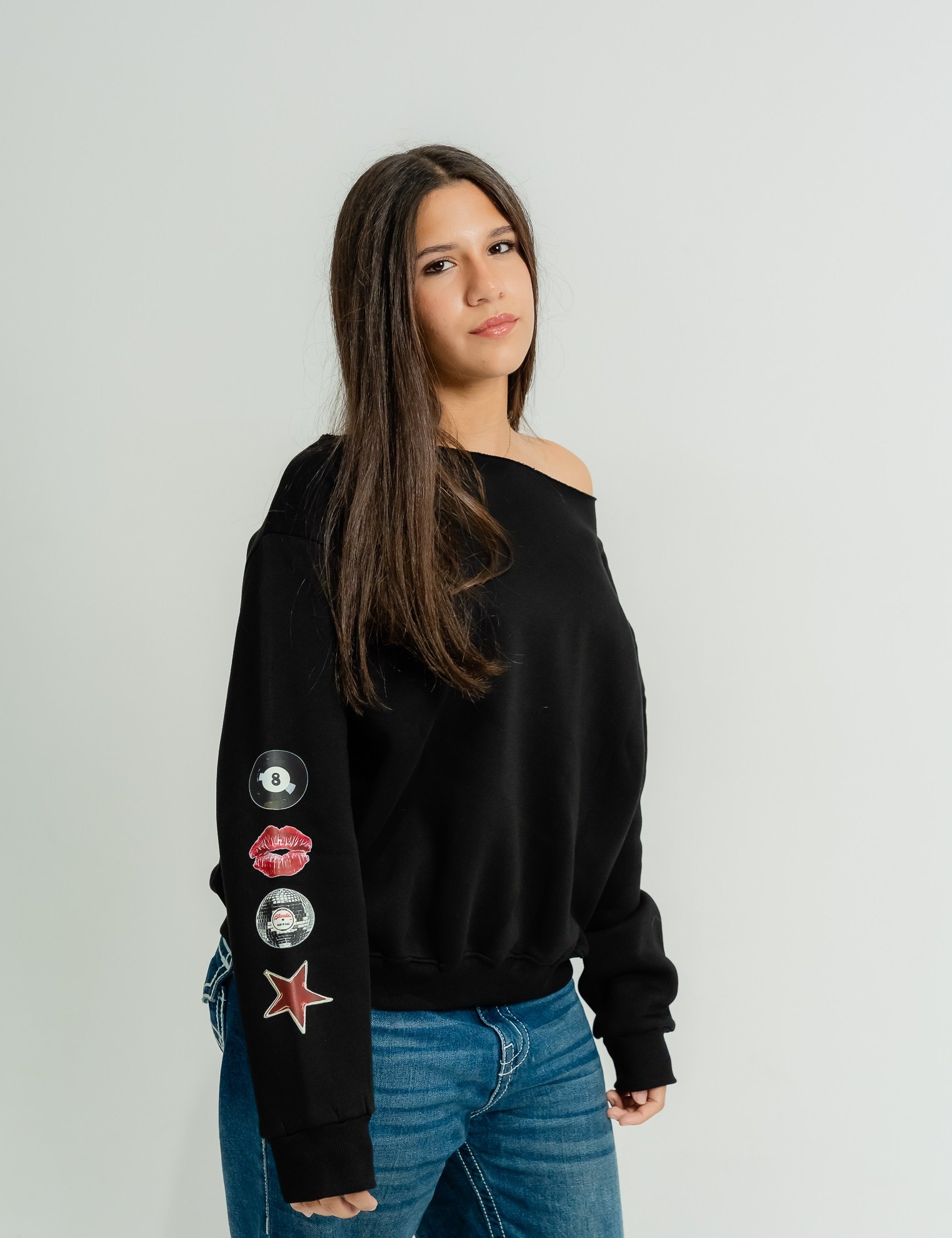 - Maroon & black sleeve patches: lips, star, 8-ball, vinyl graphic