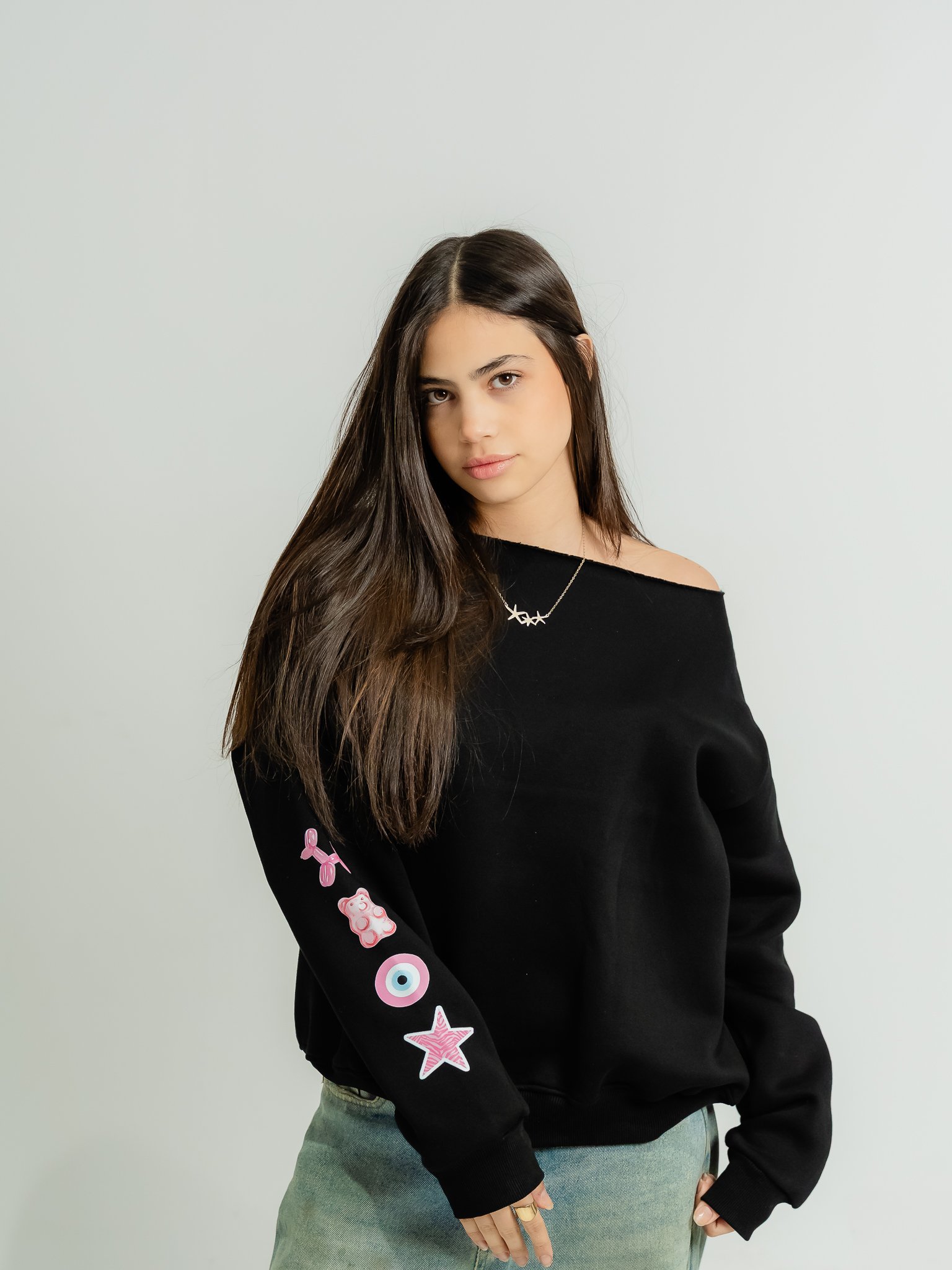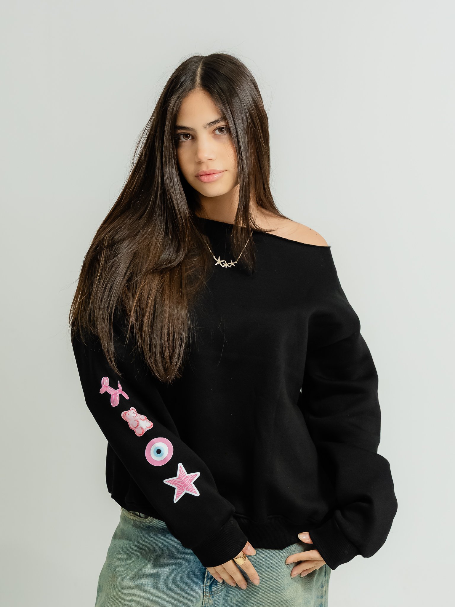 • Pink signature sleeve patches: star, balloon dog, evil eye, teddy bear